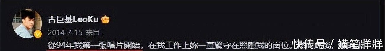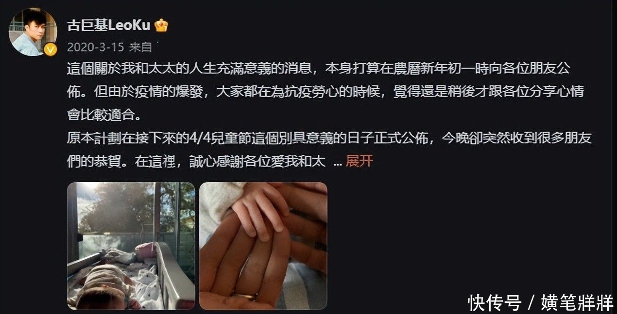 432014年,古巨基终于在微博正式公布婚讯,文字真挚动人:“从1994年我第一张唱片开始,你在工作上照顾我;此后余生,换我来守护你。”
