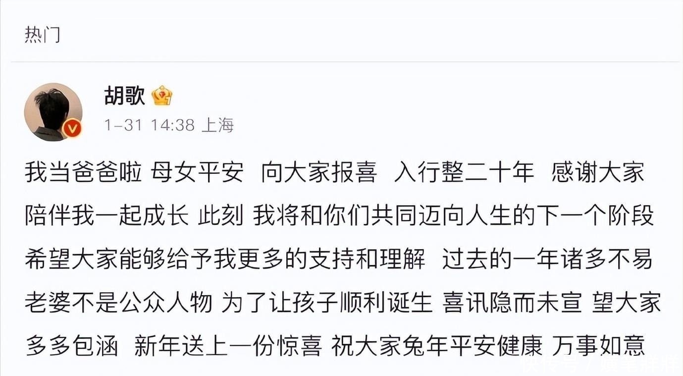 172023年1月,胡歌突然宣布喜得贵子,消息一出,无数网友直呼“心碎”。